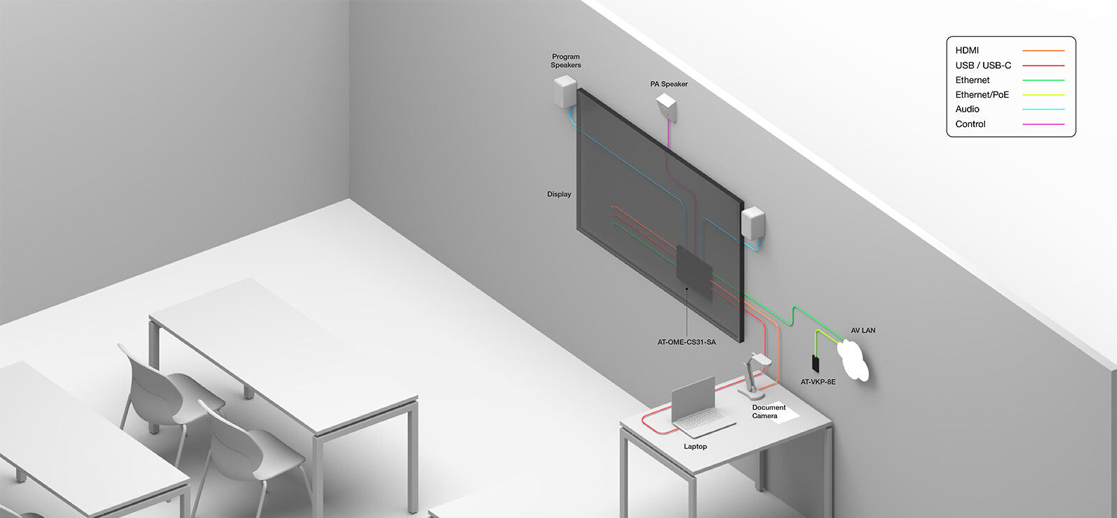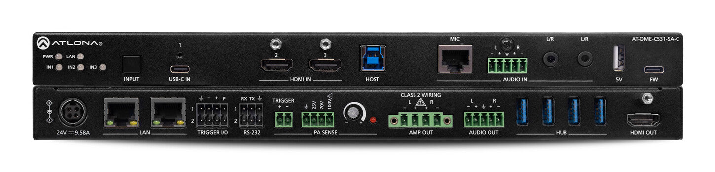 The AT-OME-CS31-SA-C is an AV presentation and collaboration system featuring a 3×1 switcher with USB-C and HDMI inputs, 50 watt mixer amplifier, and USB routing.