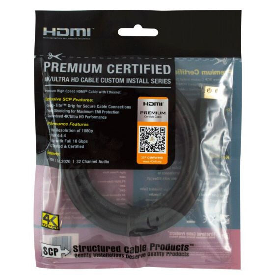 This new SCP Custom Install Series cable has been ATC tested and certified to Premium High Speed HDMI® Cable with Ethernet performance standards. SCP Premium Certified cables are specially shielded to provide maximum EMI protection. SCP Premium Certified cables are the professionals choice for 4K/Ultra HD performance and reliability.