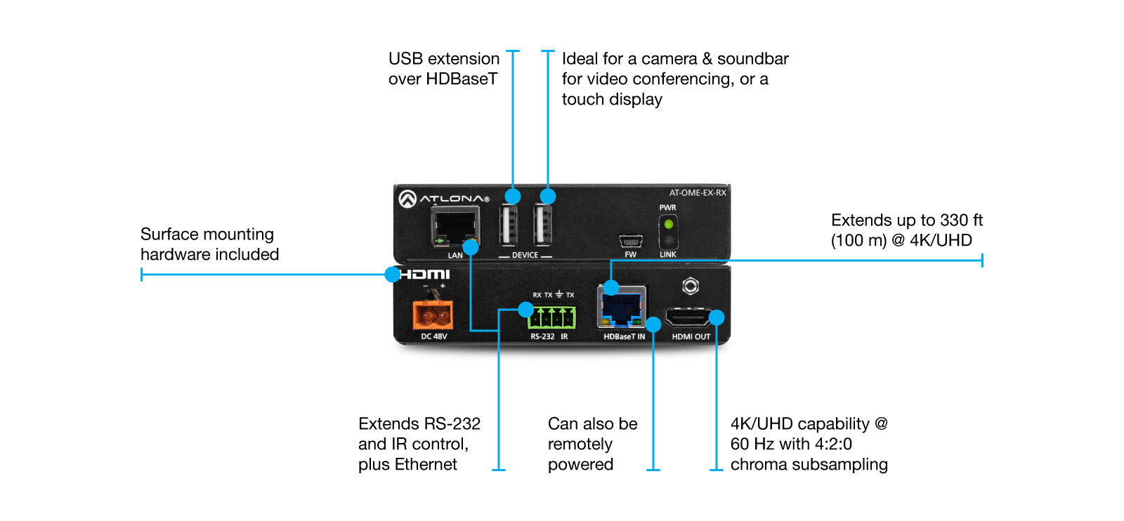 Atlona AT-OME-EX-RX. Type: AV receiver, Maximum resolution: 4096 x 2160 pixels, Cable types supported: Cat5e, Cat6, Cat6a, Cat7. Connectivity technology: Wired, USB connector type: Mini-USB A, USB Type-A. Power source type: DC, AC input voltage: 100 - 240 V, AC input frequency: 50 - 60 Hz. Width: 109 mm, Depth: 127 mm, Height: 26 mm